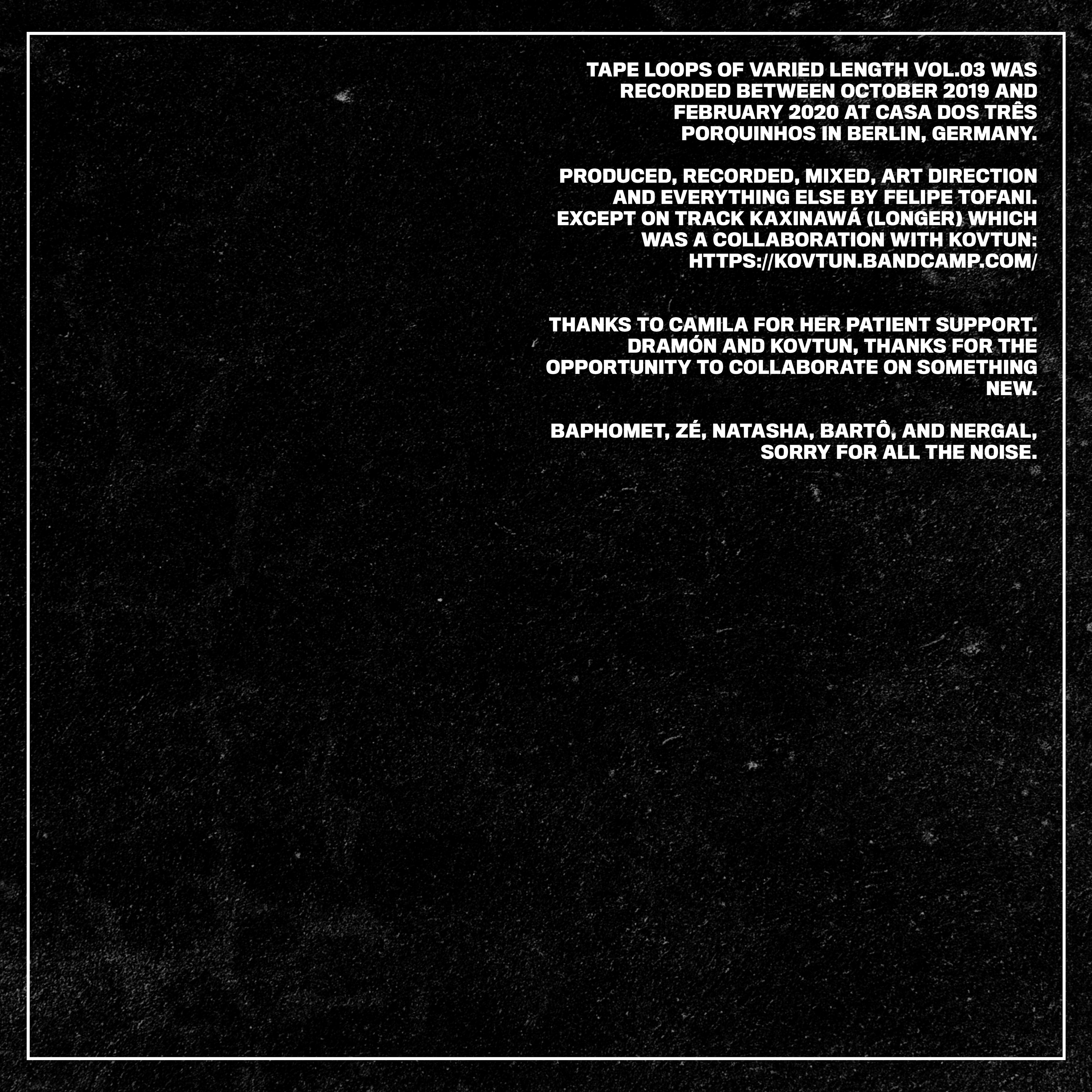 Tape Loops of Varied Length Vol.03 is more than an album; it’s a learning process. Between the previous record and this one, 135 days have passed, and many musical sketches were done. A few have survived to be presented to the world; some will never be heard again.